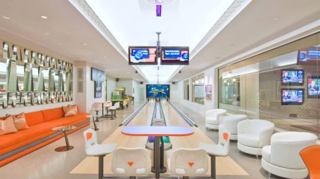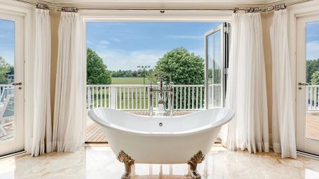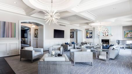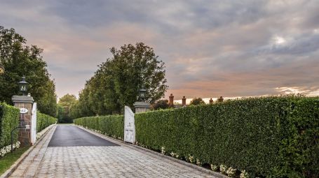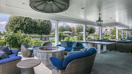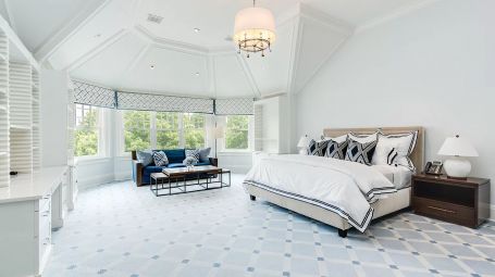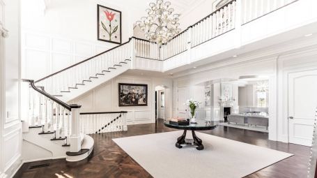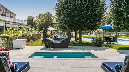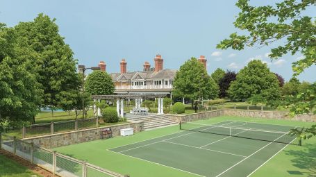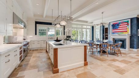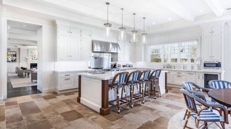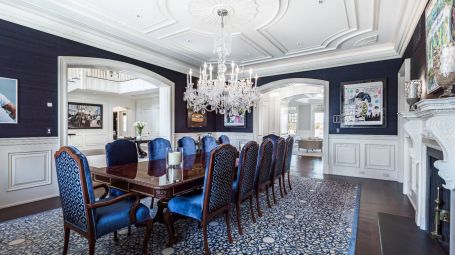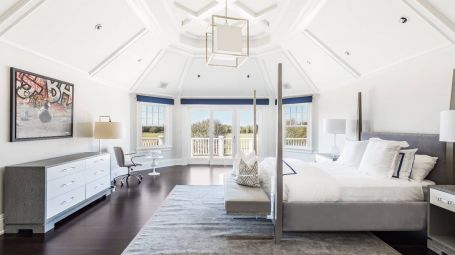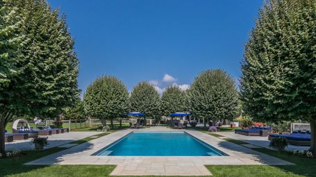 Wide arched doorways and stunning wainscotting present a lavish foyer leading to the open concept common space. A radiant white living room dazzles with deep grooved coffered ceilings and traditional wainscotting. Spectacular saturated Pop art grounds the space in postmodern refinement, harkening to the enduring legacy of the region's most acclaimed artist, Roy Lichtenstein. Stately and magnificent, the sublime crisp interiors are symmetrical, with contemporary seating arrangements between two opposing fireplaces. This common area opens unto a glorious pillared veranda looking out on the grand estate. A regal twelve-seat dining table abounds in early 20th- century aristocratic elegance garnished with a focal crystal chandelier. Cobalt accent walls in the dining room lend a contemporary edge to the traditional space. Spacious and airy, no expense is spared for the home's eleven bedrooms. With an incredible 25,000 square feet at its disposal, palatial level luxury is afforded to each private chamber. Outstanding amenities include a walnut library, ten-seat theatre, mudroom, in-home bowling alley, basketball court, and full-on spa with a jacuzzi, sauna, steam, and massage room. Majestic outdoors include a sunken tennis court, pergola, 20 X 60-foot gunite pool, and an oversized hot tub. Serene tranquility and privacy invite guests to feel the hours whizz past lounging poolside, frosty cocktail in hand. An additional baseball field and treehouse prove delightful for young and old. Bridgehampton Bliss of Bridgehampton presents the Hamptons highlife at its' most exceptional.