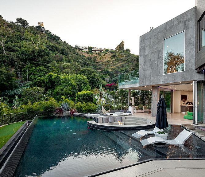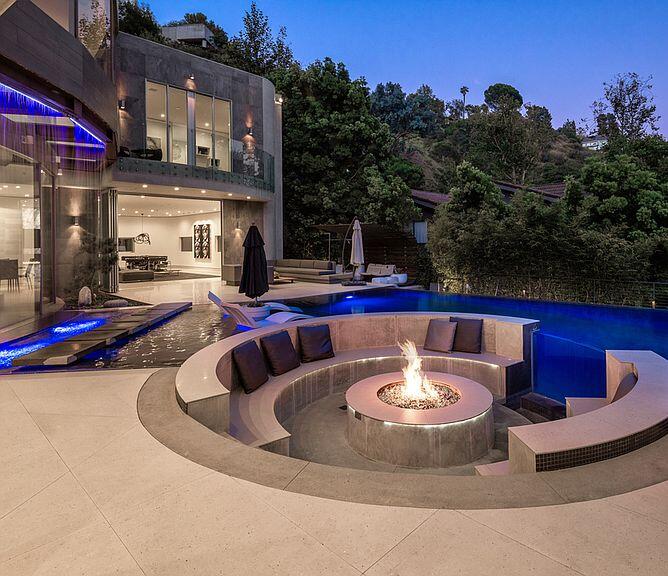 rain bar and a sunken seating area with fire-pit.