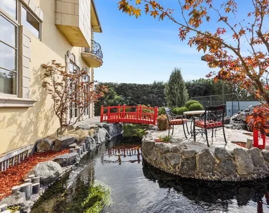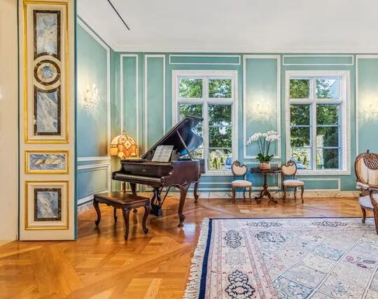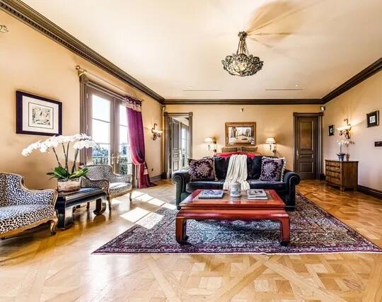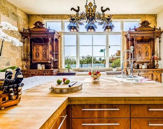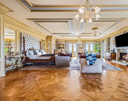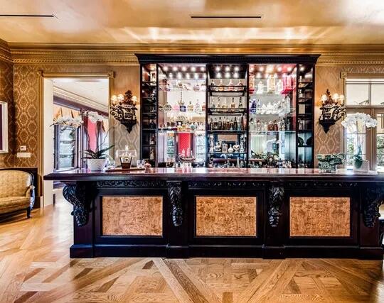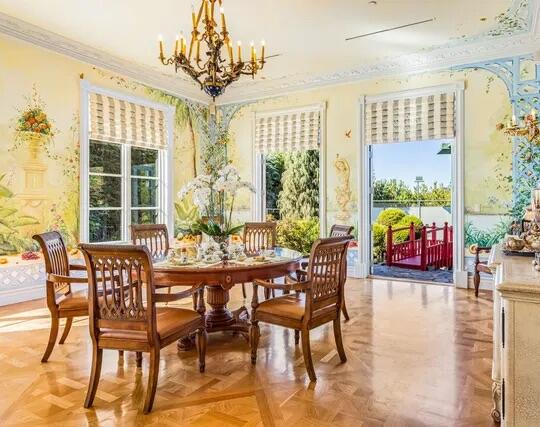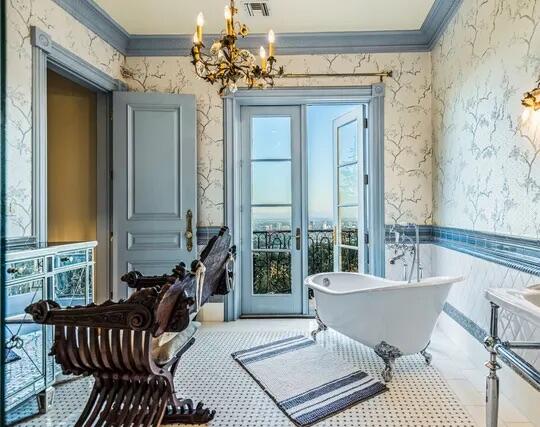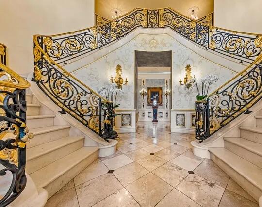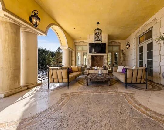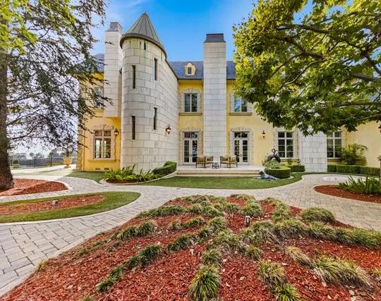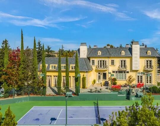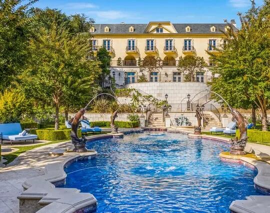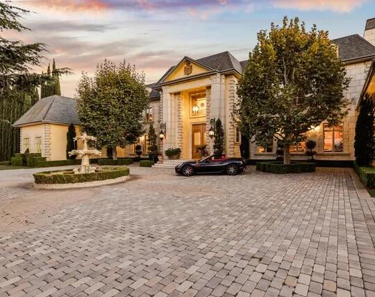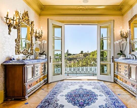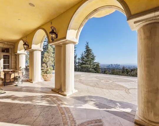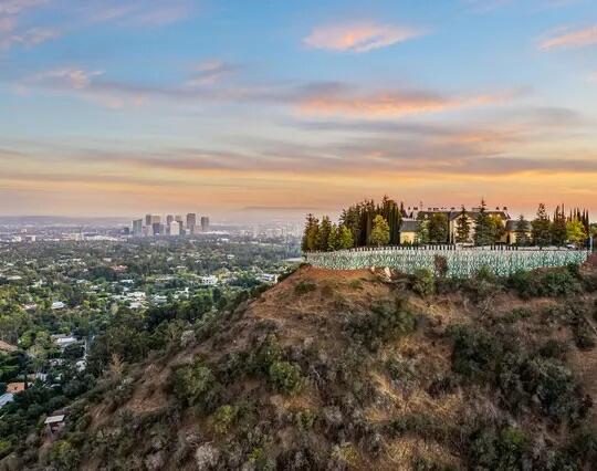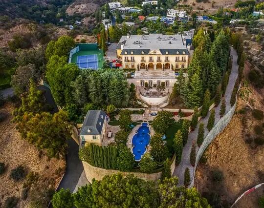Poised high atop a promontory, this palatial European Estate boasts jaw-dropping 360 degree views of all of Los Angeles. Rich in privacy behind gates and up the long tree-lined driveway, this fortress of unparalleled magnitude is revealed. Situated in a world of its own overlooking the stunning gardens and city, this home is the epitome of royal living in the most sought-after city in the country. High ceilings, ornate details and grand-scale rooms are showcased beyond the luxurious foyer and Imperial Staircase through the massive double door entrance. Highlights from the main floor include an industrial grade chef's kitchen with an adjacent light and bright breakfast room, a formal dining room with double doors made with Venetian stained glass windows, an impressive living room with a gorgeous bar and fireplace, a billiards room, and a formal sitting room. Among the many jewels of this home is the two story library which includes a steel spiral staircase and a vibrant irreplaceable stained glass light fixture. Upstairs, the master bedroom rivals that of a European castle with multiple private terraces, city and nature views, his and hers closets, a massage room and a luxurious bathroom made with lapis stone. In addition to the master suite there are four oversized en suite bedrooms each with beautiful views and walk in closets. The lower level is an entertainer's paradise with a theater, ballroom that opens up to a sprawling terrace where your guests can soak in the picturesque views, and a wine cellar that's authentically outfitted as the storefront of an early 18th century English saloon. The backyard consists of a sparkling pool and spa, outdoor kitchen, putting green, a fruit and vegetable garden, tennis court, koi pond, and endless places for dining al fresco. In addition to the various amenities, the home is also equipped with an